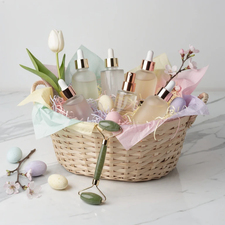 Focus on beauty and skincare with a glow-up basket. Include serums, moisturizers, and tools like jade rollers.
