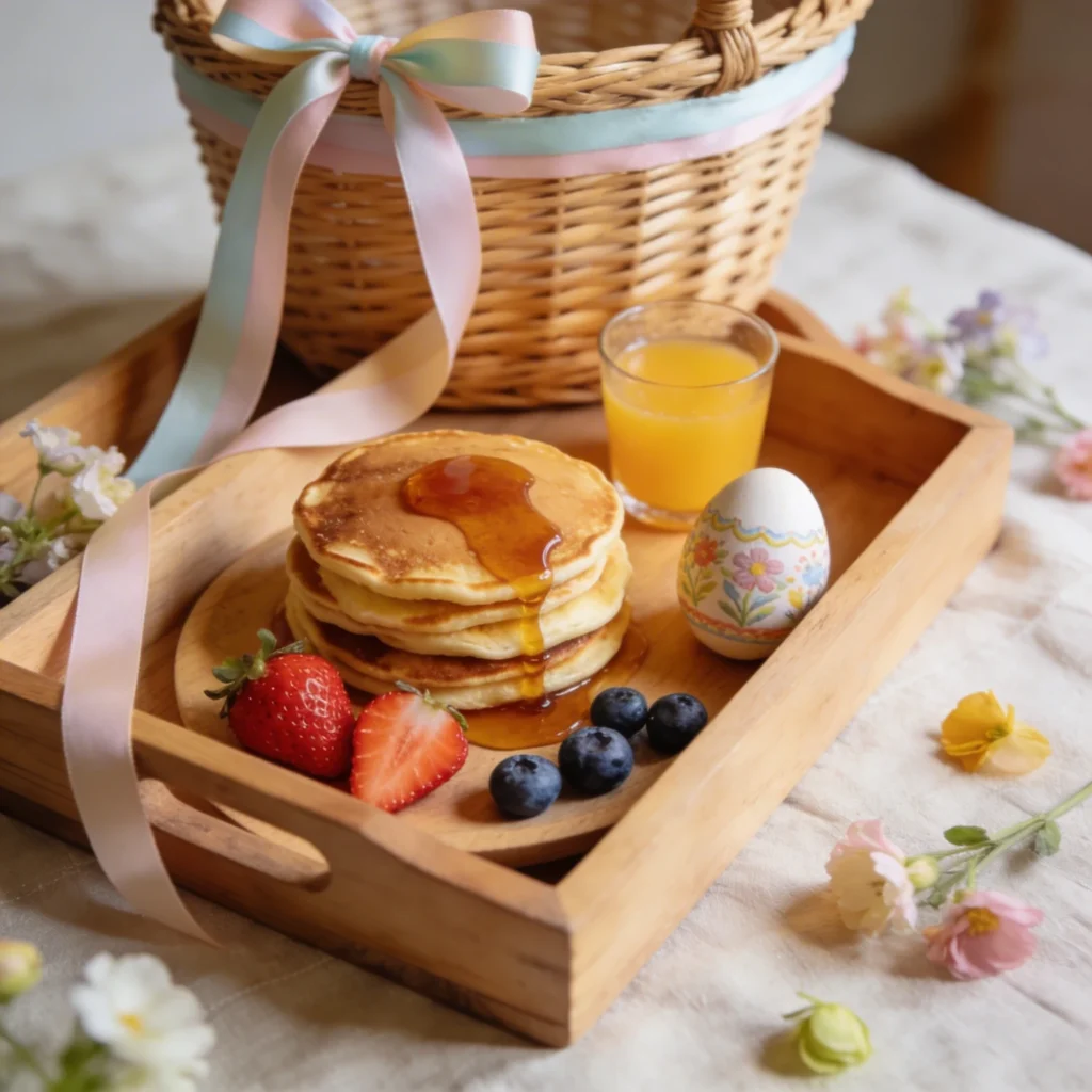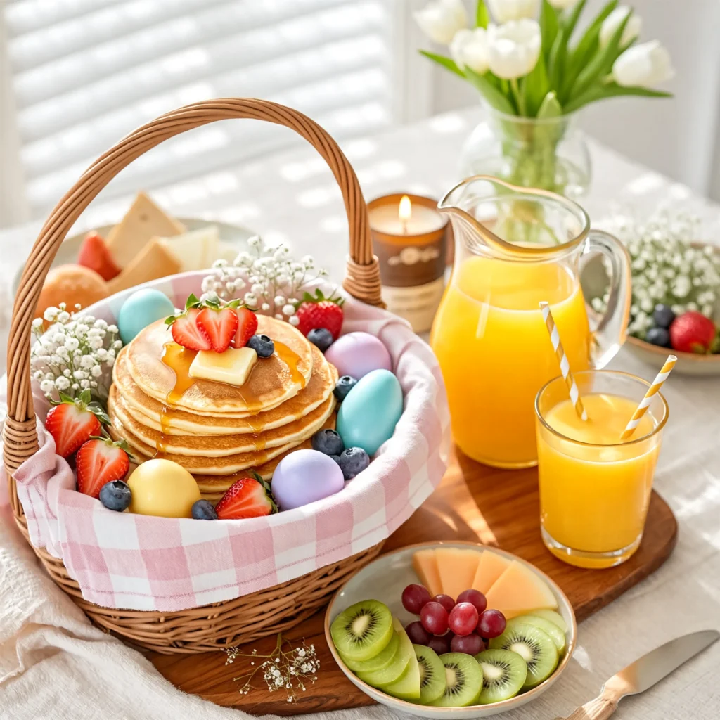 Create a breakfast-themed basket with pancake mix, syrup, and juice. It’s perfect for a cozy Easter morning.
