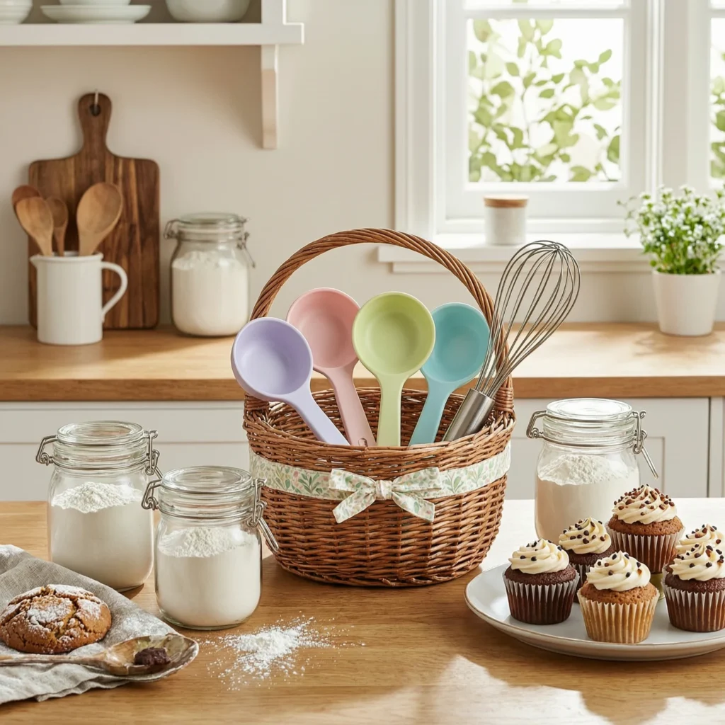 You can also include homemade cookies or cupcakes for a personal touch. This basket is both creative and functional, making it perfect for hobbyists who love spending time in the kitchen.
