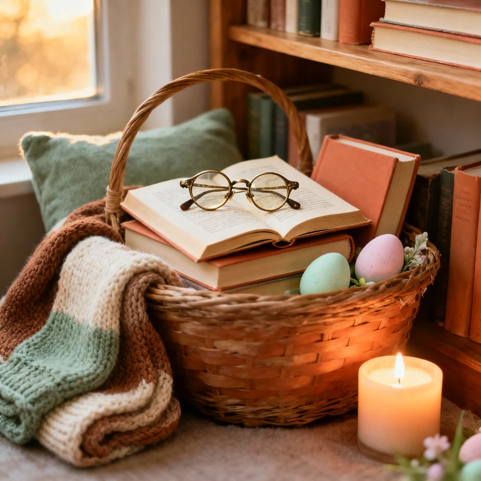 For readers, create a relaxing book-themed basket. Add a novel, cozy blanket, and a candle to set the mood. This idea is perfect for quiet and peaceful Easter moments.