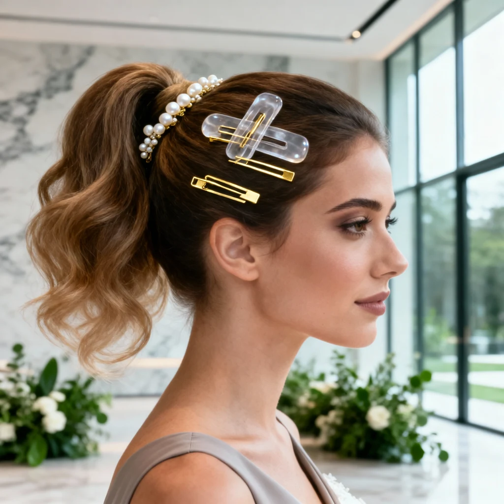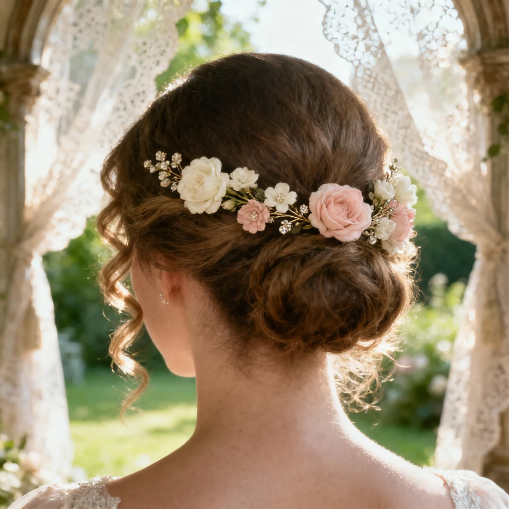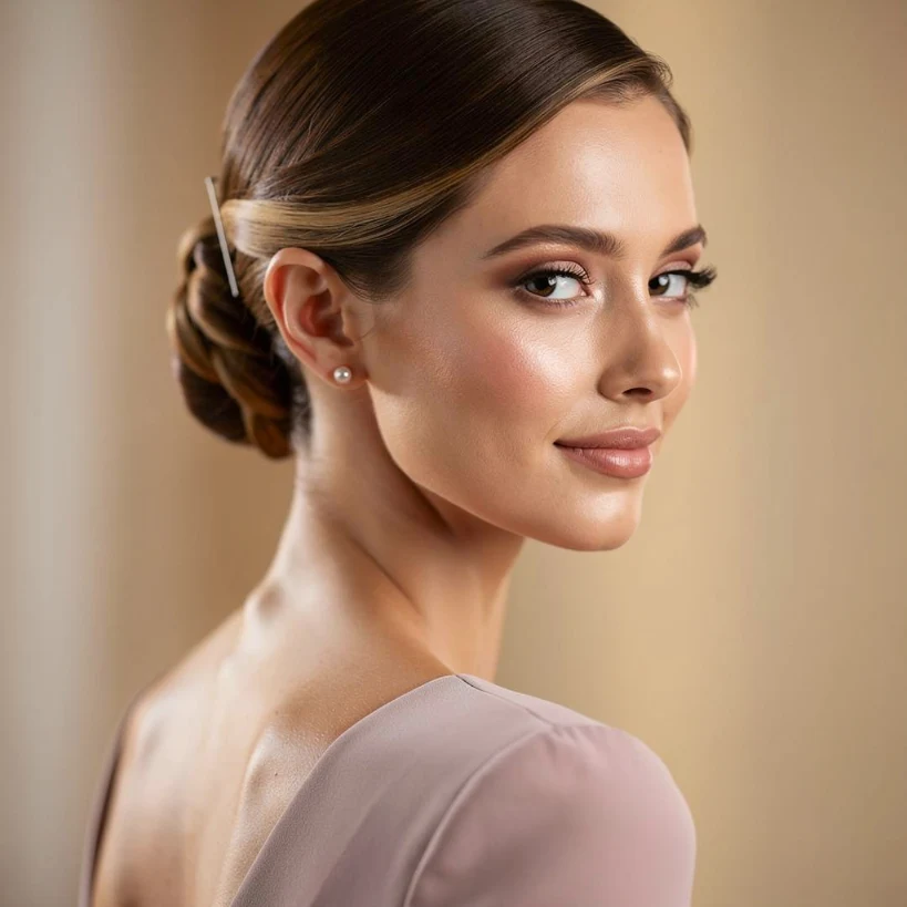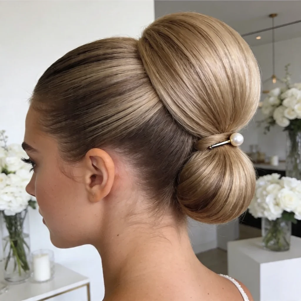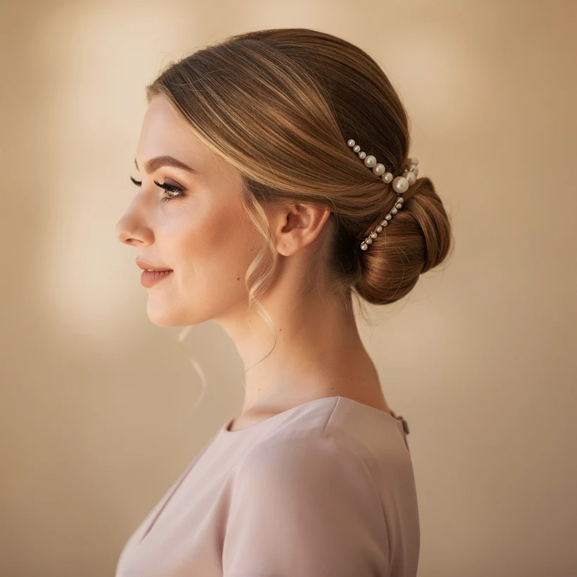 Pearl pins or delicate combs enhance the look beautifully. Ideal for traditional weddings, the chignon remains a sophisticated and reliable choice for bridesmaids.
