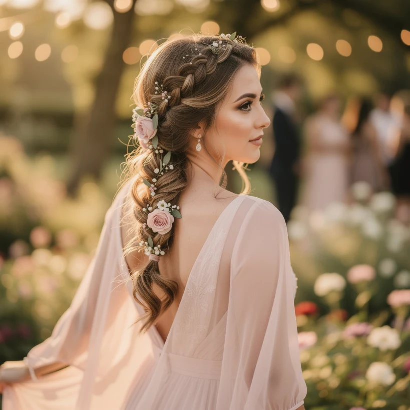 This hairstyle suits garden and boho weddings beautifully. Add small flowers or delicate pins for extra detail. The intricate design photographs stunningly and complements flowing bridesmaid dresses.