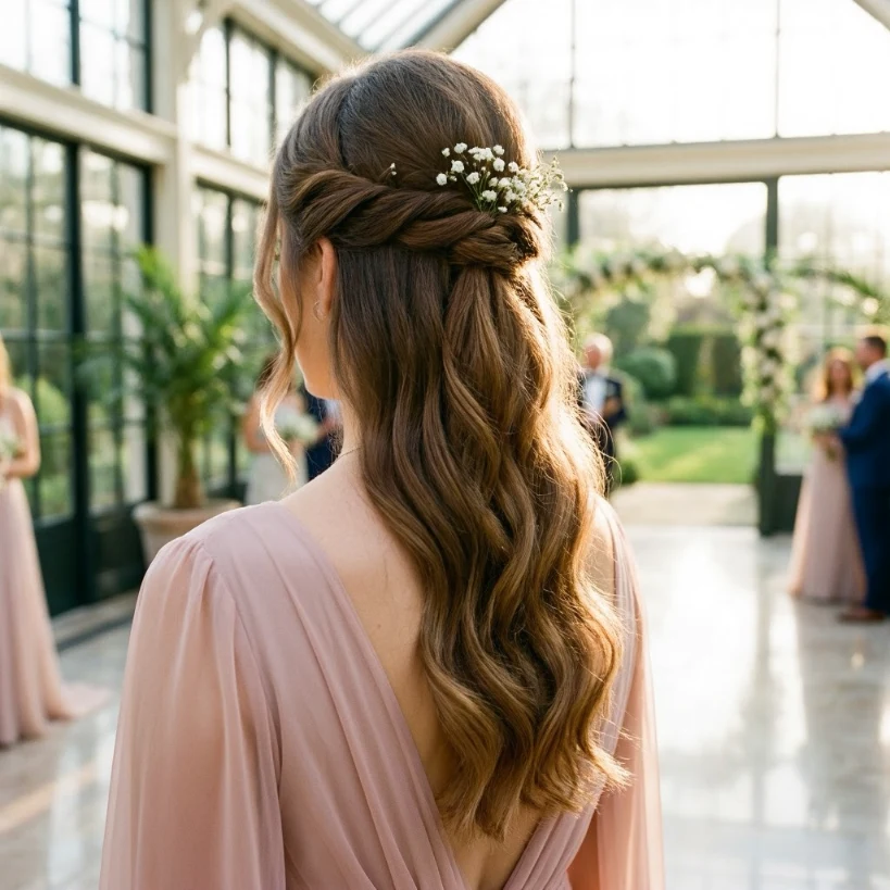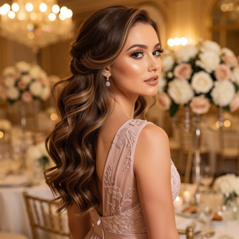Half-up twisted waves combine structure and softness. Twists gather the top section while flowing waves cascade below. The result is romantic and effortlessly elegant.