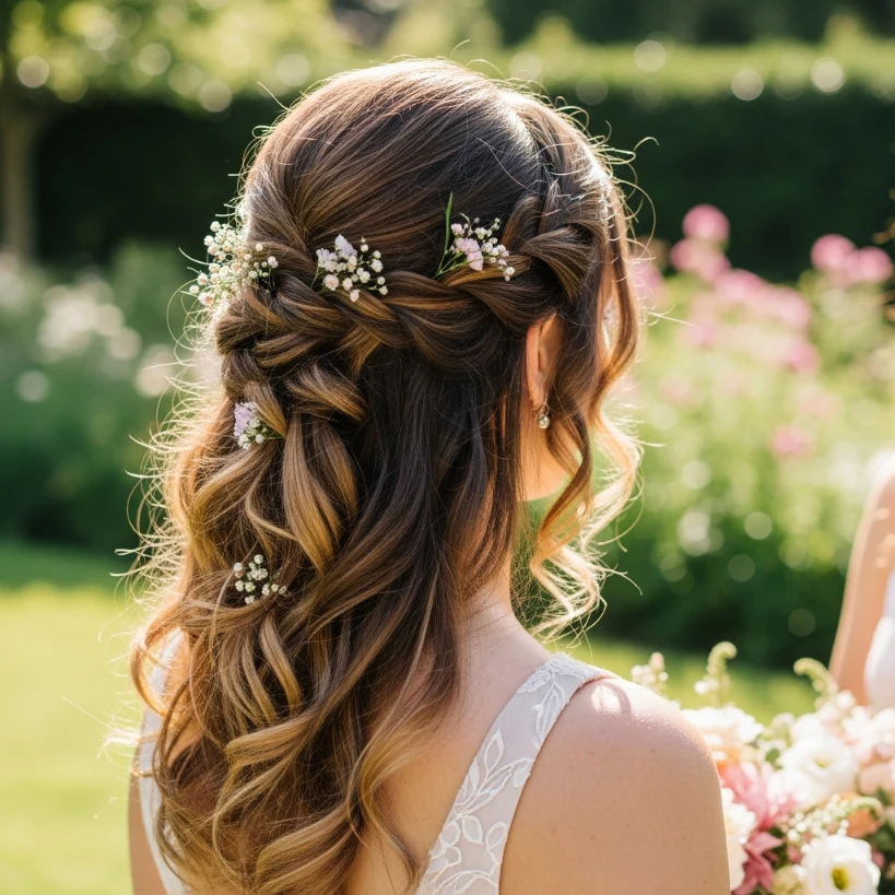 This style works for both formal and semi-formal weddings. It keeps hair away from the face while showcasing length and texture. The balanced look suits many dress styles and wedding themes.