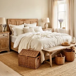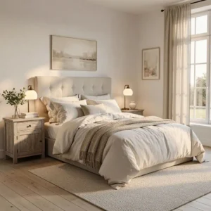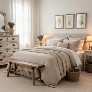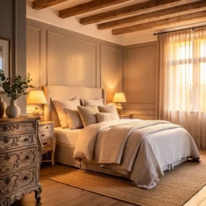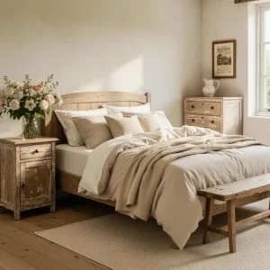 Layer the palette with linen bedding, textured throws, and subtle patterns for depth. Rustic wooden nightstands or antique-style furniture add charm without overwhelming the design. This combination balances simplicity and elegance, giving the bedroom a relaxed yet sophisticated countryside feel.