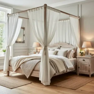Sheer curtains soften the structure while adding intimacy. Keep surrounding décor minimal so the bed remains the centerpiece. This feature adds timeless charm.