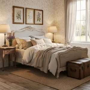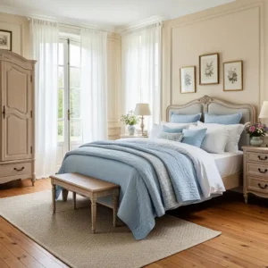 Linen bedding is a signature element of French country bedrooms. Its relaxed texture and breathable fabric create a comfortable yet refined look. Soft wrinkles add character rather than appearing messy.