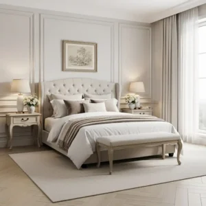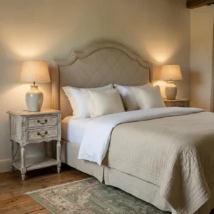 A tall upholstered headboard instantly elevates a French country bedroom. Choose soft fabrics like linen or velvet in neutral tones to maintain the room’s gentle aesthetic. The padded texture adds comfort while introducing a touch of understated luxury.
