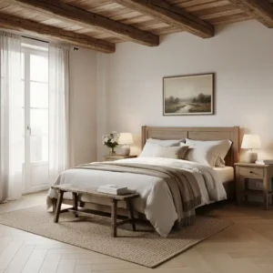 Rustic wood accents add warmth and authenticity to a modern French country bedroom. Exposed beams, weathered bed frames, or wooden side tables bring natural texture and a sense of history.