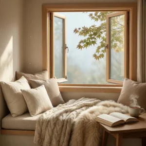 Add a throw blanket and a small basket for books nearby. The gentle sunlight and outdoor views enhance the peaceful mood. This type of nook feels bright, cozy, and wonderfully relaxing.