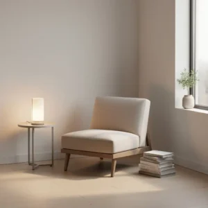 A minimalist reading nook focuses on simplicity and calm. A comfortable chair, a small lamp, and a clear space for books are all that’s needed. The uncluttered design helps maintain focus and tranquility.