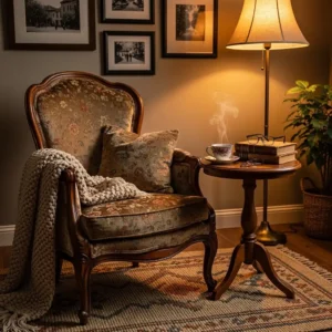 A vintage armchair adds character and charm to a reading nook. Its classic design creates a timeless atmosphere perfect for slow reading moments. Pair it with a warm lamp and a small wooden table.