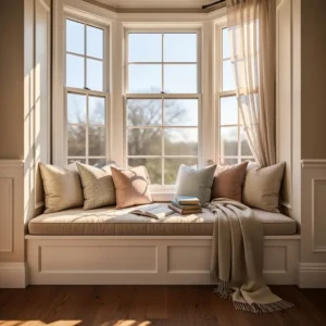 Choose neutral fabrics and textured pillows to enhance warmth without overwhelming the space. Built-in storage beneath the seat can hold books or blankets, keeping everything organized. This simple nook turns a quiet corner into a relaxing retreat perfect for peaceful afternoons.