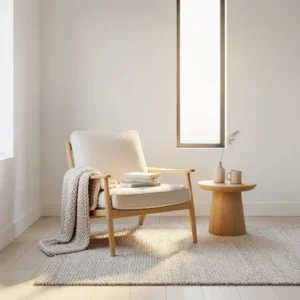 Scandinavian design emphasizes warmth through simplicity. A soft chair, light wood furniture, and neutral fabrics create a calm reading environment. Natural light enhances the serene atmosphere.