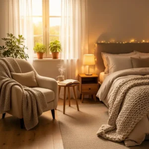 Add a small side table for tea or coffee, along with a textured rug underfoot. Keep nearby shelves stocked with favorite books for convenience. The cozy layering of light, fabric, and furniture makes this nook feel personal and welcoming.