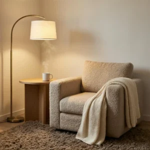 A plush armchair paired with a warm floor lamp instantly creates a comfortable reading spot. This classic setup works beautifully in living rooms, bedrooms, or even unused corners. The combination of supportive seating and soft lighting encourages relaxation and focus.