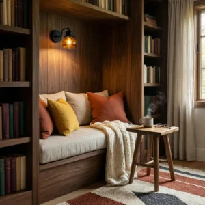Add thick cushions and a soft throw to make the seating area comfortable. Warm lighting above the shelves enhances the atmosphere. This arrangement encourages quiet moments of escape, making reading feel like a daily ritual rather than a rare treat.