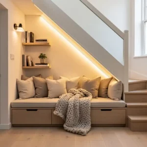 The space beneath a staircase often goes unused, making it perfect for a cozy reading nook. A small bench or pile of floor cushions transforms this compact area into a charming hideaway. With the right lighting, it becomes a peaceful retreat.