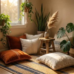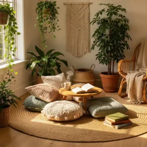 Floor cushions create a relaxed and flexible reading nook with a laid-back feel. Layer different pillows and textured rugs to build a comfortable seating area. This casual style works well in bedrooms or living rooms.
