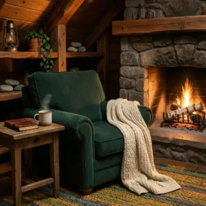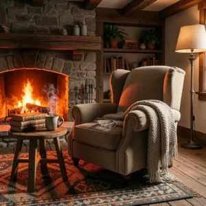 A reading nook beside a fireplace offers unmatched warmth and comfort. The gentle glow of firelight creates a relaxing atmosphere ideal for slow evenings with a book. A comfortable armchair and a soft blanket complete the cozy scene.