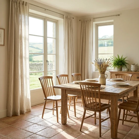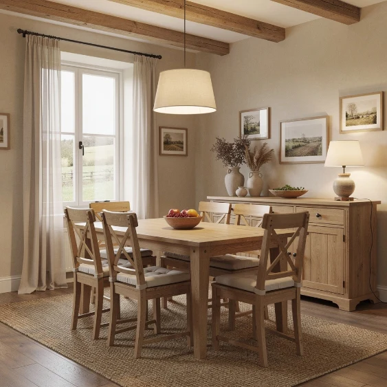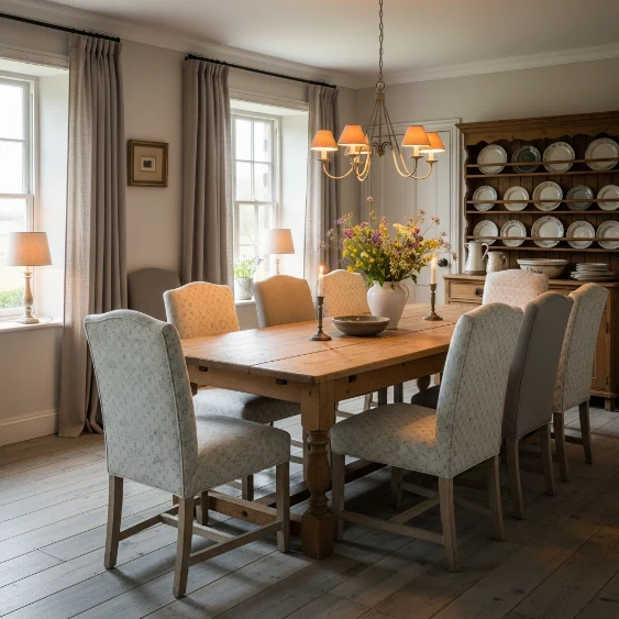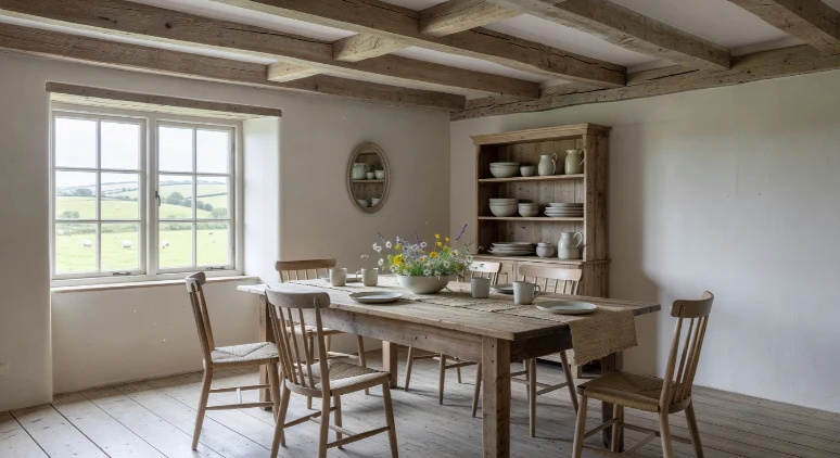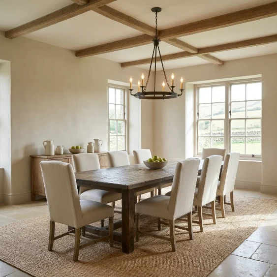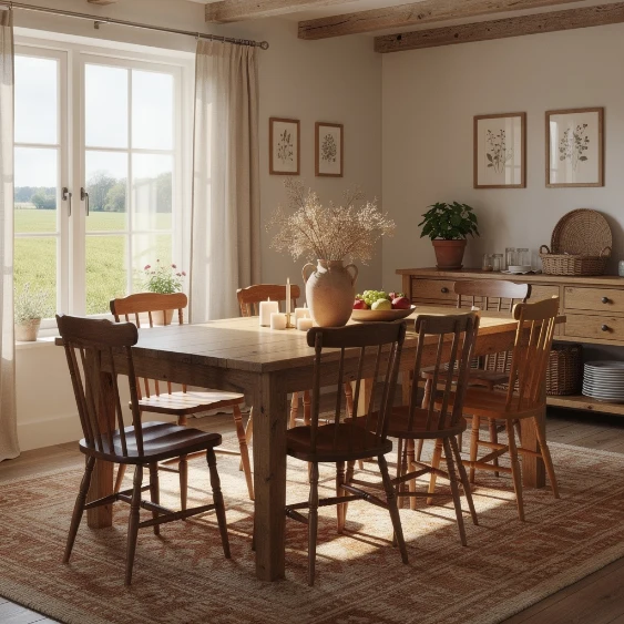 A large rustic farmhouse table is the heart of an English countryside dining room. Solid wood with visible grain and a slightly worn finish creates warmth and authenticity. The table instantly sets a welcoming tone, encouraging long meals and relaxed gatherings with family and friends.