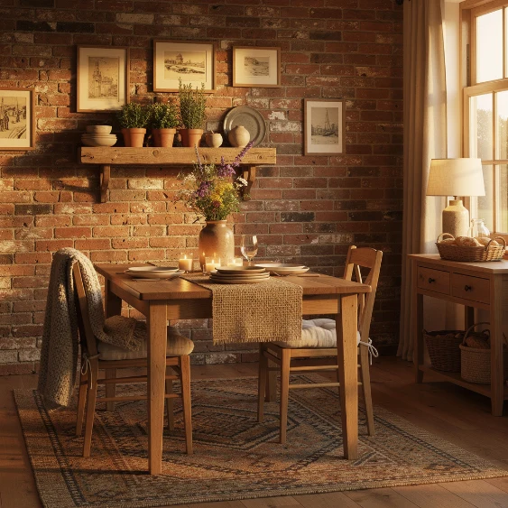 Stone or brick walls bring depth and rustic charm. The texture creates a cozy backdrop that pairs beautifully with wood furniture.