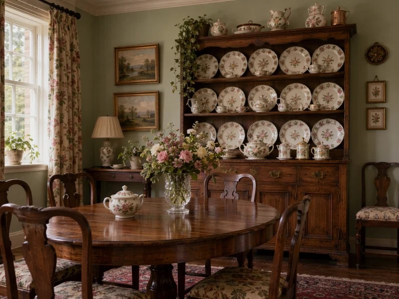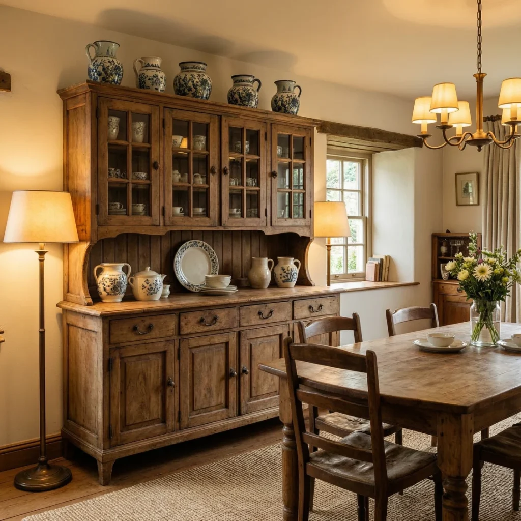 A vintage china cabinet adds both storage and charm to a countryside dining room. Displaying delicate floral dishes or heirloom pieces enhances the traditional aesthetic.