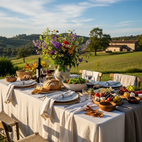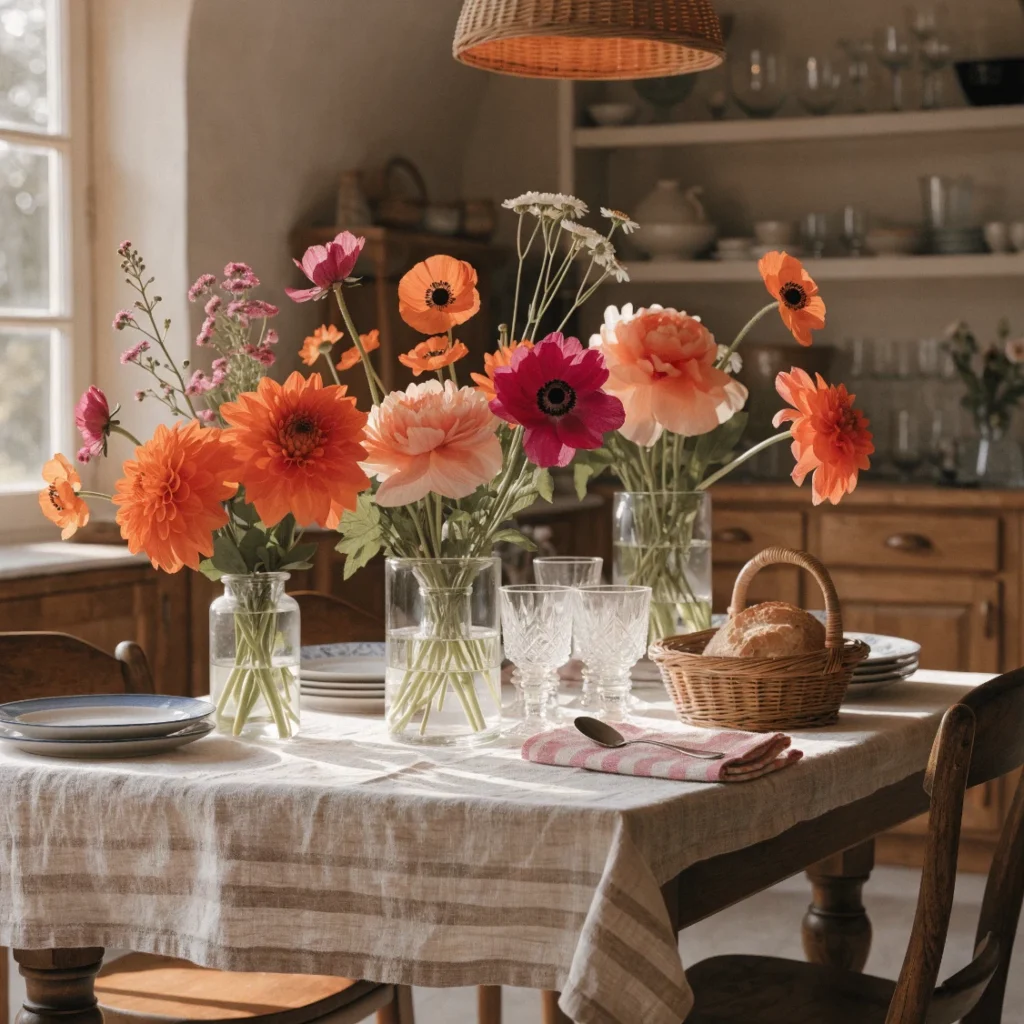 Fresh flowers add life and color to the dining table. Seasonal blooms bring a natural countryside feel.