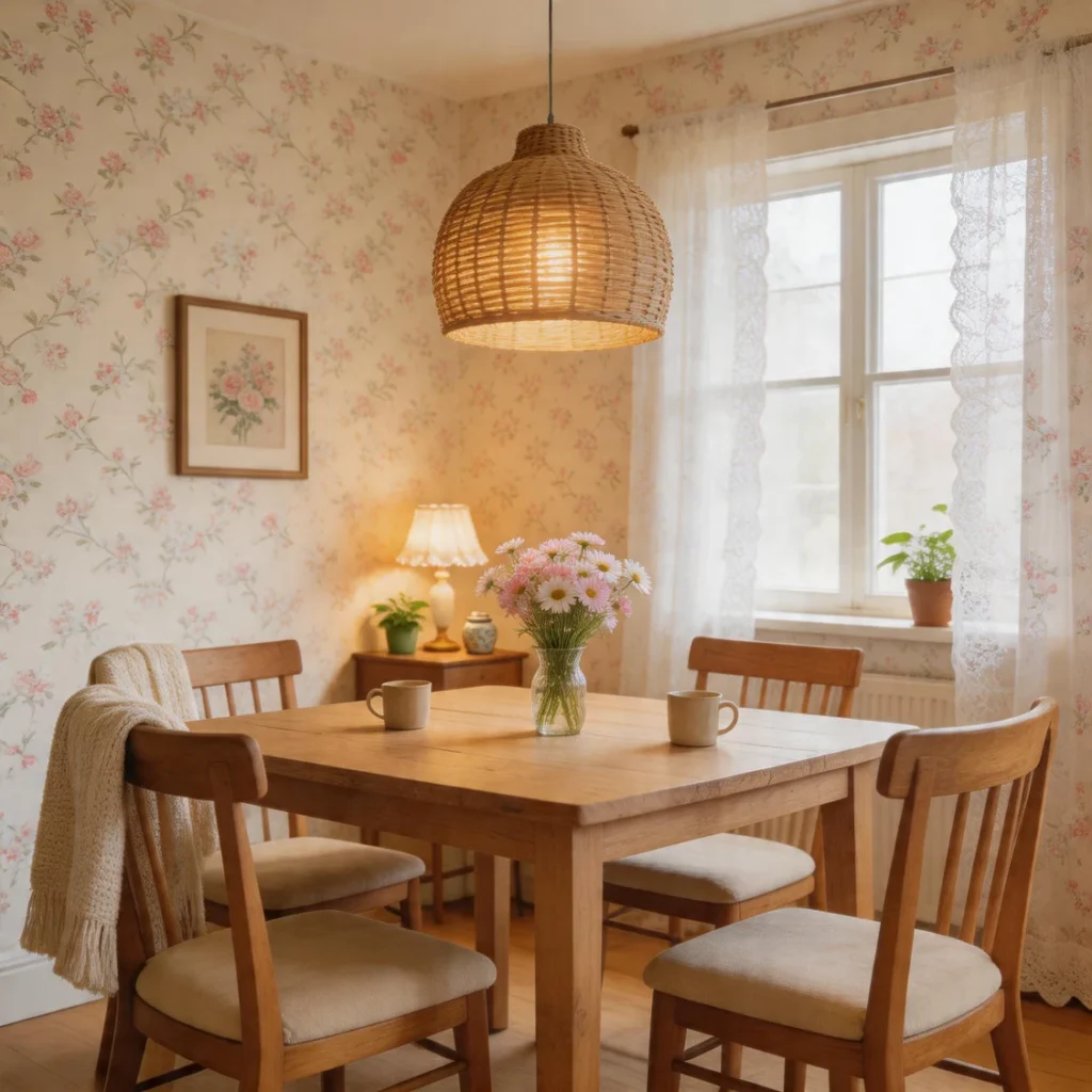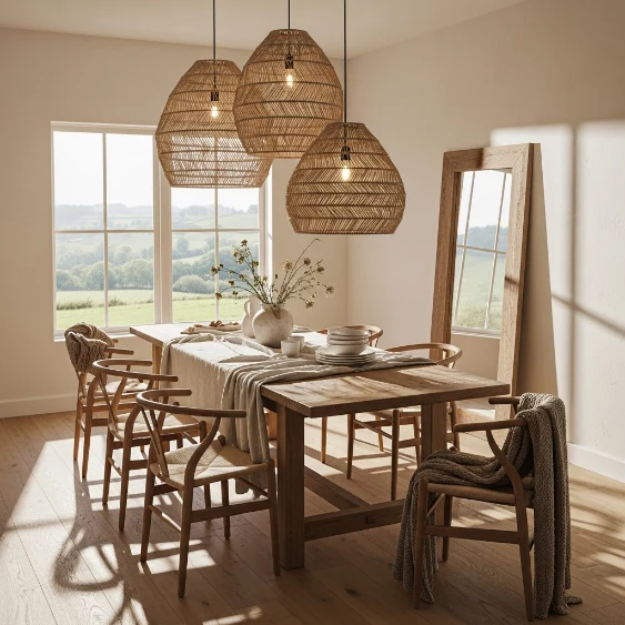 Woven pendant lights introduce natural texture and warmth. Their soft glow enhances the relaxed countryside atmosphere.