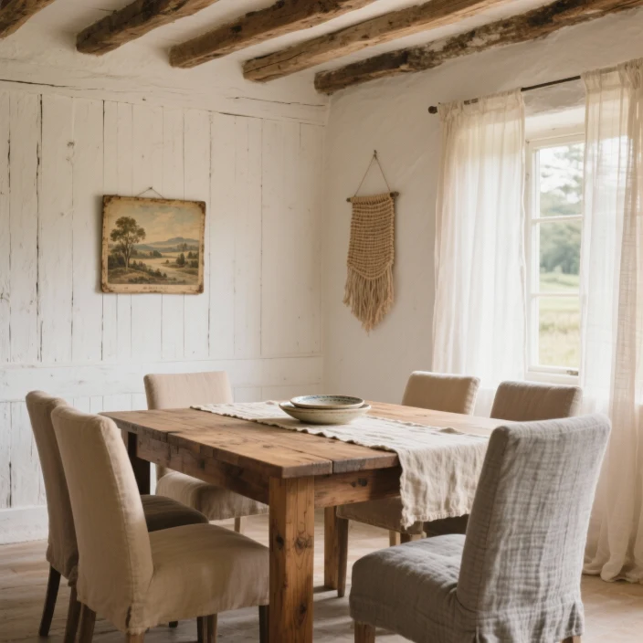 Pair the table with mismatched vintage chairs or simple wooden seating. Add a linen runner and ceramic dishes for a layered, cozy look. This timeless centerpiece brings comfort, charm, and a sense of tradition to the dining space.