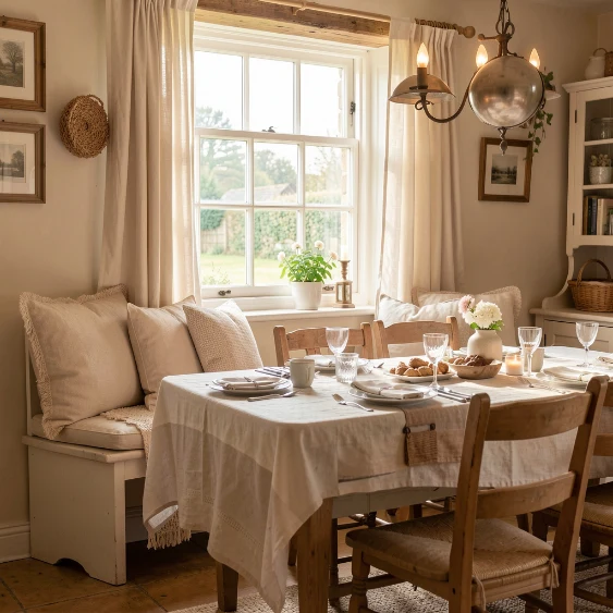 A built-in window seat creates a charming dining nook. Soft cushions and neutral fabrics make the space cozy and inviting.