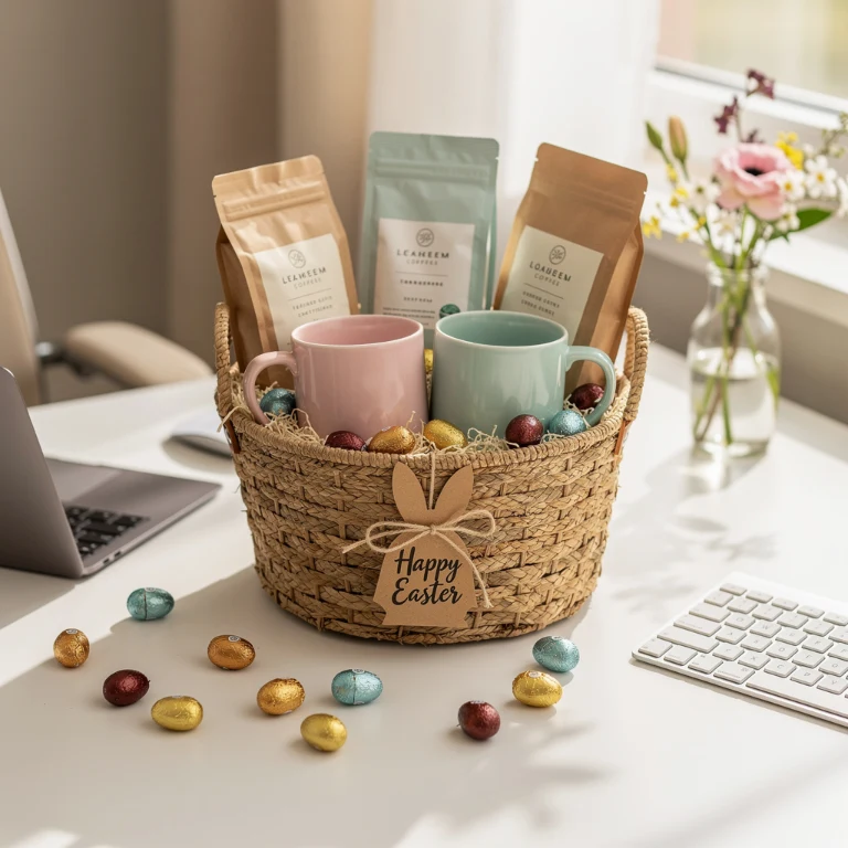 For coworkers who run on caffeine, a coffee-themed Easter basket is a guaranteed hit. Include small-batch coffee blends, flavored syrups, and a stylish mug in soft spring colors. Adding chocolate-covered espresso beans or biscotti makes the basket feel extra indulgent and thoughtful without being overly expensive.