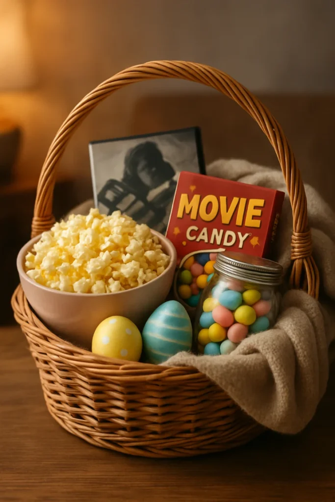 Create a cozy movie night experience with popcorn, candies, and a soft blanket. This basket feels warm and inviting, perfect for relaxing weekends.