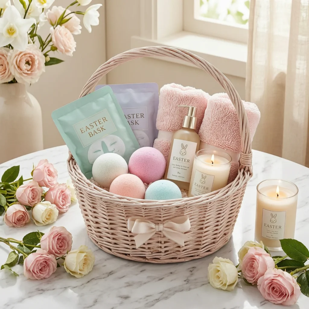 It’s an ideal gift for promoting wellness in the workplace. Add a small note encouraging relaxation and balance, which makes the basket even more meaningful. The soft pastel packaging enhances the Easter theme while keeping it elegant and Instagram-ready.