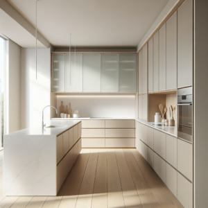 Beige minimalist cabinets bring warmth to sleek, modern kitchens without overpowering the design. Their soft neutral tone balances crisp white countertops and clean-lined hardware, creating a calm and inviting cooking space. Flat-panel doors enhance the contemporary aesthetic while maintaining a clutter-free look that feels effortlessly elegant and highly functional for everyday living.