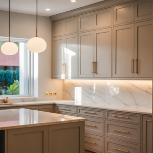 Image Prompt: Shaker-style beige cabinets offer classic charm while maintaining modern versatility. The clean frame detailing adds subtle texture, making the cabinetry feel refined yet approachable. When paired with brushed gold hardware, beige cabinets instantly elevate the kitchen’s overall aesthetic, creating a space that feels both polished and welcoming without appearing overly ornate.