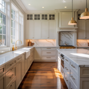 Quartz or marble countertops enhance the cohesive elegance of the space. Gold or brass fixtures can add warmth and a hint of glamour, while maintaining a soft, timeless palette. This look works especially well in transitional kitchens where classic elements blend seamlessly with modern finishes.