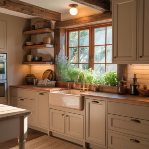 Farmhouse beige cabinets exude comfort and nostalgic charm. Slight distressing or soft matte finishes enhance the lived-in feel, making the kitchen warm and inviting. Beige tones soften the rustic aesthetic, preventing the space from feeling too heavy or overly traditional.