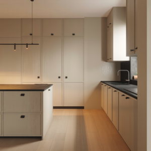 Pairing beige cabinetry with light oak flooring and subtle metallic accents enhances the serene atmosphere. The neutral palette allows natural light to bounce beautifully across the room, making the kitchen appear larger and brighter. This style is perfect for homeowners who appreciate simplicity, understated luxury, and timeless design that won’t feel outdated in a few years.