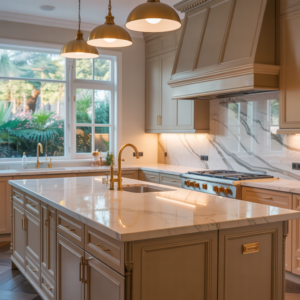 Marble backsplashes and white quartz countertops complement the softness of beige tones beautifully. The combination of gold accents and neutral cabinetry introduces warmth and sophistication, ideal for transitional kitchens that blend traditional and contemporary elements. This look works especially well in open-concept homes where the kitchen needs to harmonize seamlessly with surrounding living spaces.