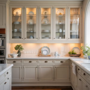 Interior cabinet lighting enhances the display while adding a warm glow during evening hours. Paired with light countertops and subtle hardware, this design feels airy and inviting. It’s a perfect solution for homeowners who want a decorative touch while maintaining a neutral, cohesive color scheme.