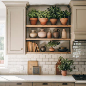 Beige cabinets paired with open shelving create a light and personalized kitchen atmosphere. The neutral base allows decorative items, plants, and ceramics to stand out beautifully. Open shelves break up solid cabinetry, making the space feel larger and less enclosed.