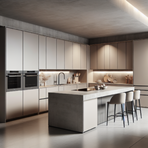 Matte beige cabinets with minimal or hidden hardware create a streamlined and contemporary kitchen aesthetic. The soft matte finish absorbs light gently, giving the space a calm and refined appearance. This look emphasizes clean lines and simplicity without sacrificing warmth.