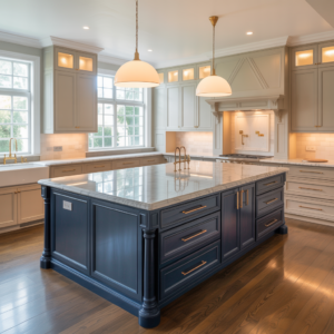 Introducing a navy blue island alongside beige cabinets creates a stunning focal point. The deep blue adds richness and contrast, while beige cabinetry maintains warmth and balance throughout the space. This combination feels bold yet timeless, ideal for kitchens that serve as both functional and social hubs.