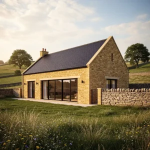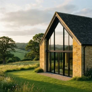A hallmark of Cotswolds architecture is the warm honey-colored limestone used in traditional cottages and barns. In modern barn homes, this timeless stone exterior is paired with large contemporary windows that bring in abundant natural light. The combination preserves the charm of historic countryside buildings while introducing modern openness.