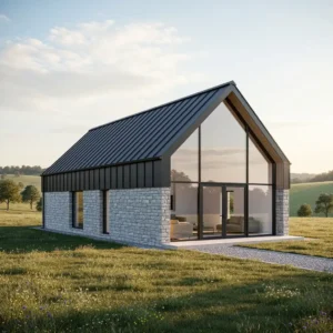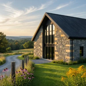Black-framed windows create striking contrast against the pale stone, highlighting the clean geometry of the structure. Surround the home with simple landscaping such as wild grasses or gravel paths. This design blends heritage materials with modern architecture, resulting in a barn house that feels both rustic and refined.