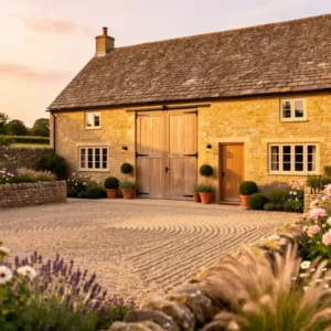 Gravel courtyards are a common feature of traditional Cotswolds farmsteads. They provide a practical yet charming approach to the home. The soft crunch of gravel adds sensory character to the entrance.