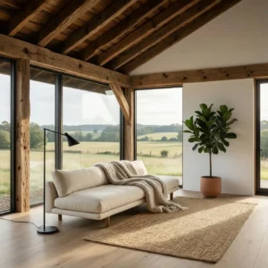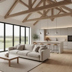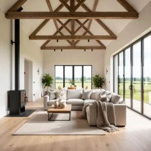Double-height living spaces are a defining feature of modern barn conversions. Inspired by traditional barns, these soaring interiors create an airy atmosphere filled with natural light. Exposed wooden beams emphasize the structure’s heritage while adding warmth and character.