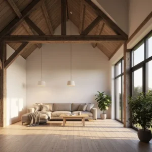 Exposed wooden beams celebrate the structural beauty of barn architecture. In modern homes, these beams are often preserved or replicated to maintain a connection with traditional design. Their natural texture adds warmth and authenticity to bright interiors.