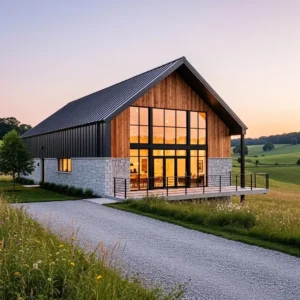 Black metal-framed windows add a modern edge to traditional barn architecture. Their bold lines contrast beautifully with natural stone exteriors, creating a striking visual statement. These windows also allow plenty of daylight to fill the interior spaces.